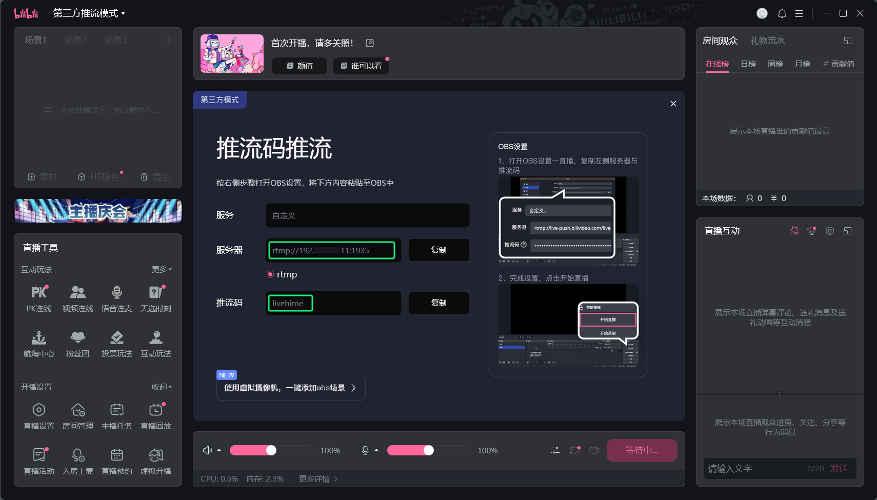哔哩哔哩(bilibili)怎么用OBS开播?OBS开播教程 2025-05-25 OBS专区 1、准备工作: 在哔哩哔哩完成实名认证;下载直播姬(哔哩哔哩官方的直播伴侣); 2、登录直播姬,左上角选择“第三方推流模式”; 3、此时就会显示服务器和推流码(串流密钥),如下图; 4、打开OBS Studio,通过来源下的“ + ”号添加好直播内容,点击「 设置 」; 5、依次点击「 直播 」- 服务选择「 自定义 」,将服务器选择地址复制粘贴到OBS中的「 服务器 」一栏,将推流码复制粘贴到OBS中的「 推流码 」(或串流密钥)一栏,点击「 确定 」; 6、点击「开始直播」; 提示:成功推流后,右下角会有码率变化 以下是直播间画面截图 免责声明:本站对会员仅提供安装、咨询等服务,部分文章及下载资源收集于网络,不保证软件的使用时长、完整性及安全性,请下载后自行测试,资源仅供学习和交流使用,版权归资源原作者所有,若本站发布的内容若侵犯到您的权益,请联系站长删除,我们将及时处理! 0 1 bilibiliOBS哔哩哔哩直播