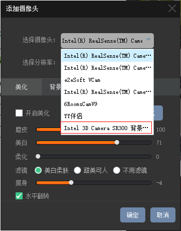 2、进入频道后,按照正常添加摄像头的方式,在摄像头添加页面,可以看到识别到4个Intel摄像头,选择“Intel3D camera SR300 背景消除”,即可实现自动背景消除。
