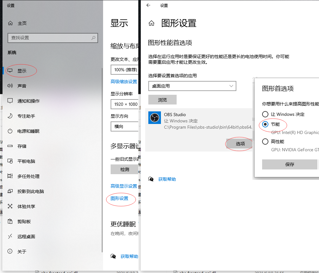 方法三:打开开始界面,点击“设置”——“系统”——“显示”——“图形设置”——“浏览”中找到“OBS程序”进行添加,在添加的OBS上选择“选项”——“节能”,点击确定就可以了。