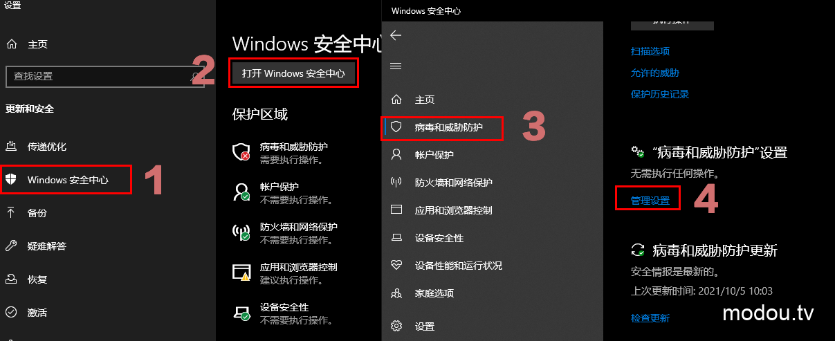 点击左下角的Windows图标—设置—更新与安全—Windows安全中心—打开Windows安全中心—病毒和威胁防护—管理设置,如下图所示: