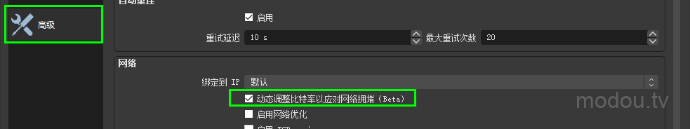 2. 选择高级并向下滚动。在网络部分,选中绑定到 IP下的动态更改比特率以管理拥塞的复选框 。