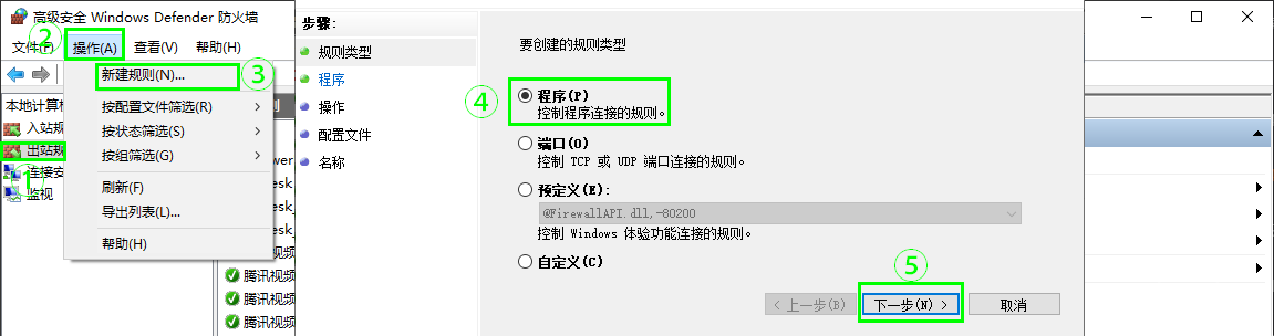 3. 在左窗格中,选择出站规则并单击操作菜单。单击“新建规则”为防火墙创建规则,单击要创建的规则类型的程序。单击“下一步”。