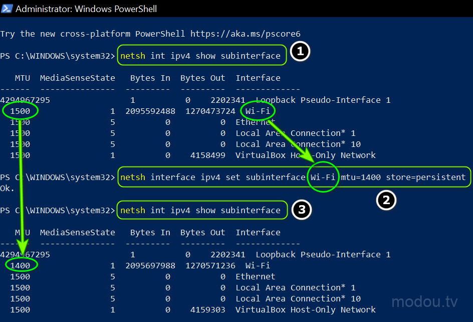 netsh inteface ipv4 set subinterface <subinterface name> mtu=1400 store=persistent