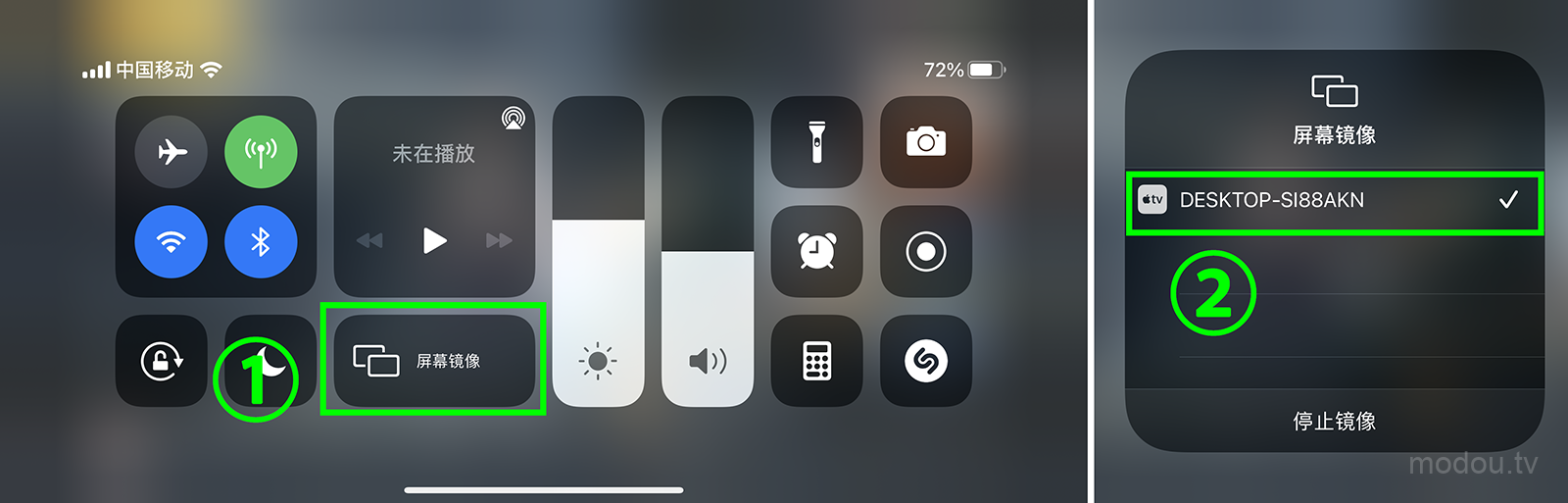 2、从手机屏幕右上角向下滑动,找到并点击屏幕镜像