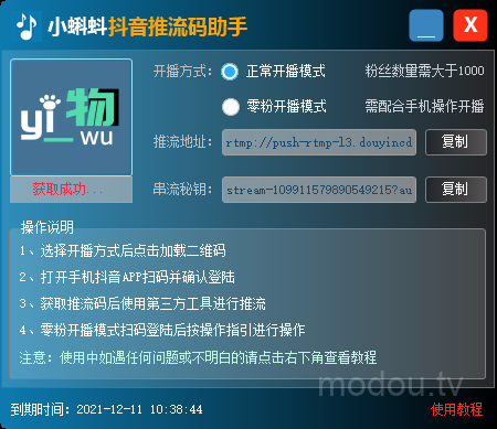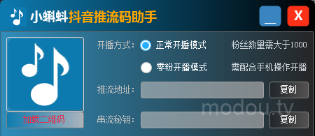 4、打开小蝌蚪-抖音推流码助手,选择正常开播模式(没有电脑直播权限选择零粉开播模式)