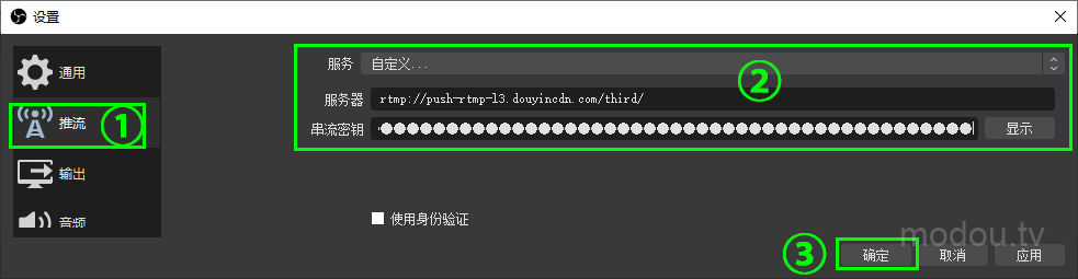 7、打开OBS,依次点开“ 设置 ”——“ 推流 ” ——服务选择“自定义”,将小蝌蚪中获取到的推流地址复制粘贴到OBS中的“服务器”一栏,将串流密钥复制粘贴到OBS中的“串流密钥”一栏;点击确定