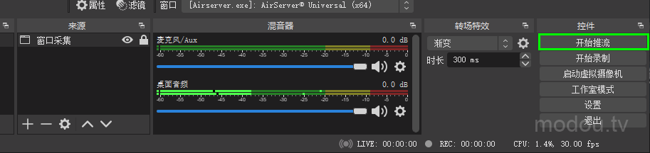 3、电脑端打开OBS,在来源一列依次点击“ + ”——“ 窗口采集 ”——窗口选择“ Airserver.exe ”——“ 确定 ”