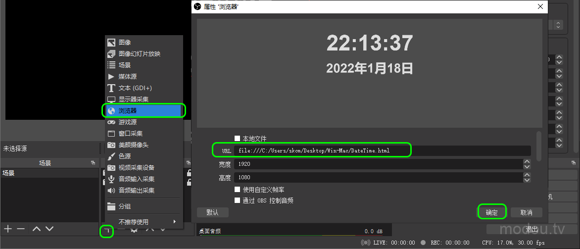 2、打开OBS,点击来源下的“+”号——选择“浏览器”,在URL中输入粘贴浏览器网址,点击确定即可