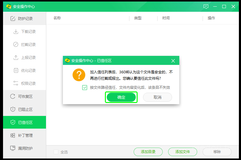 在弹出的提示框中,勾选文件路径信任,点击“确定”。