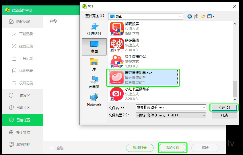 点击“添加文件”,在电脑中找到魔豆推流助手.exe并打开。
