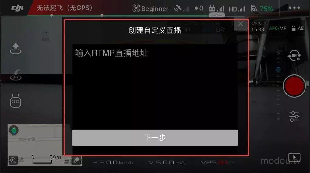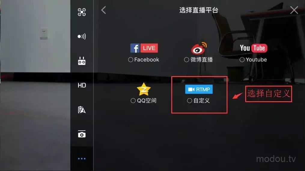 在DJI GO(大疆无人机app)里选择直播平台“自定义”→RTMP,填写rtmp地址(rtmp地址在趣看视频云后台获取,抖音/小红书/快手/…可以通过魔豆推流助手获取)。