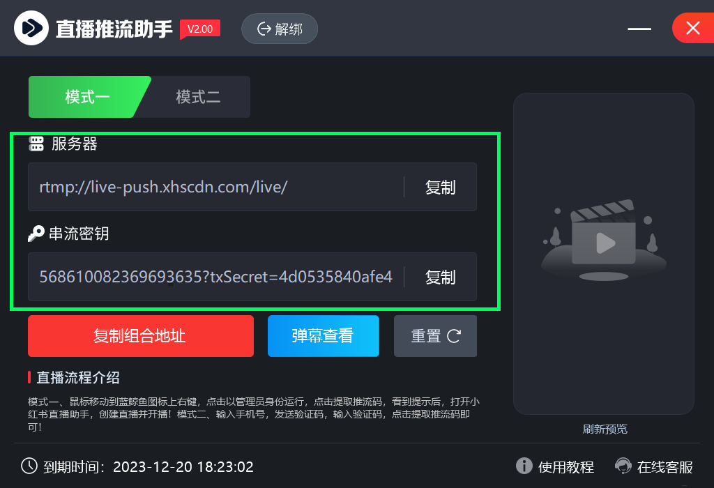 4、此时,蓝鲸鱼直播助手已经提取到小红书推流地址和串流密钥(如下图);