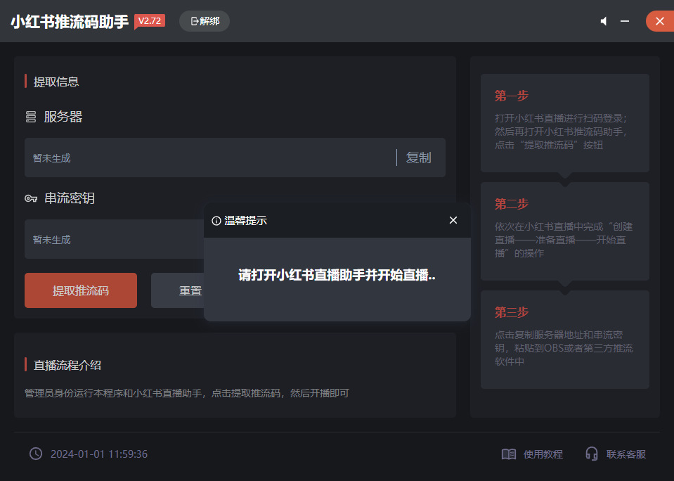 2、鼠标移动到小红书推流码助手图标上,鼠标右键“以管理员身份运行”,登录后点击提取推流码,当看到“请打开小红书直播助手并开始直播”的提示后转到小红书直播助手页面;