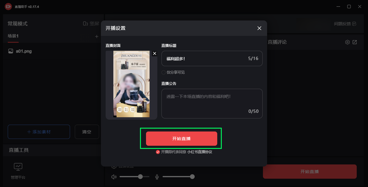 3、在小红书直播助手中输入直播标题和封面,点击开始直播