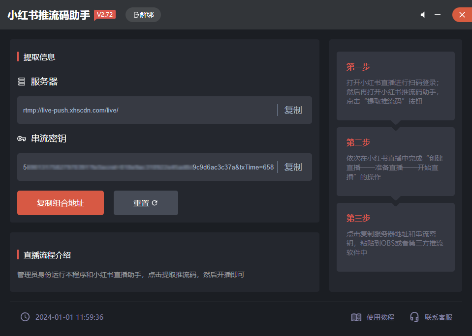 4、开播后,小红书推流码助手就已经提取到小红书推流地址