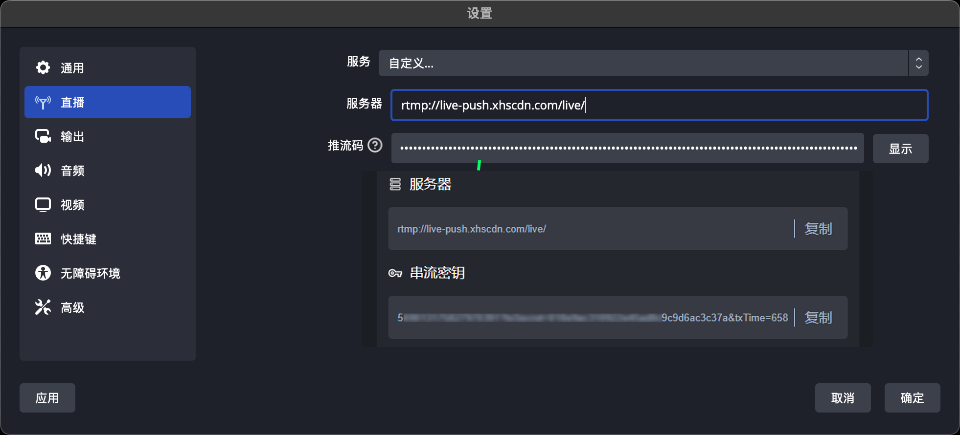 7、依次选择「直播」— 服务选择「 自定义 」,将提取到的服务器地址,复制粘贴到OBS中的「服务器」中,将串流密钥复制粘贴到OBS中的[推流码]中,点击“ 确定 ”