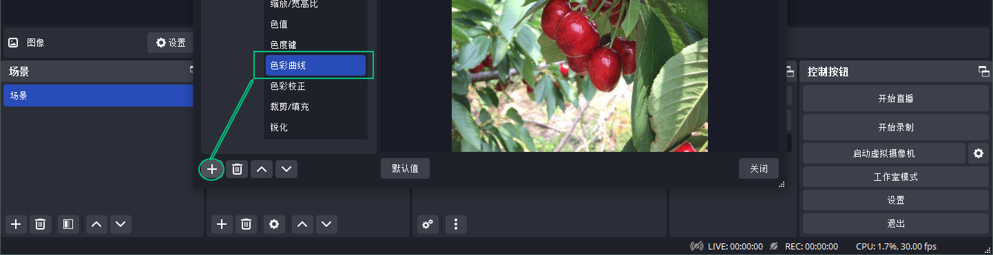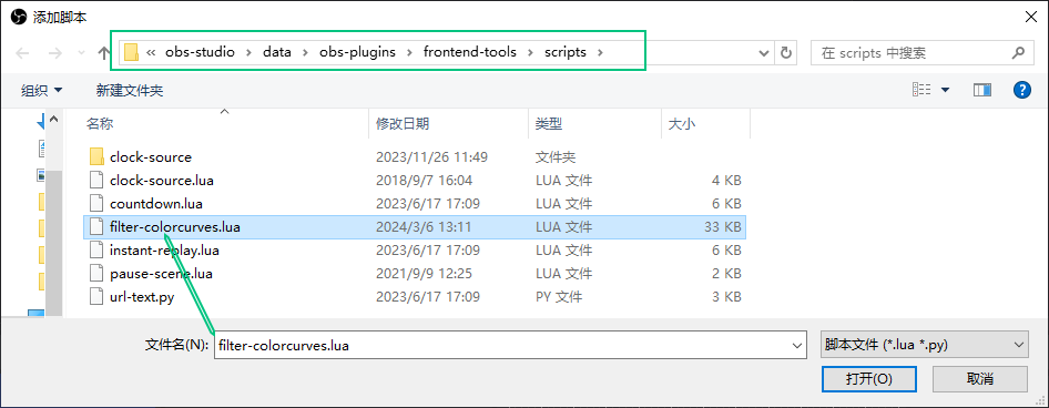 关闭OBS,将下载的脚本文件 filter-colorcurves.lua 拖到obs-studio\data\obs-plugins\frontend-tools\scripts 目录下