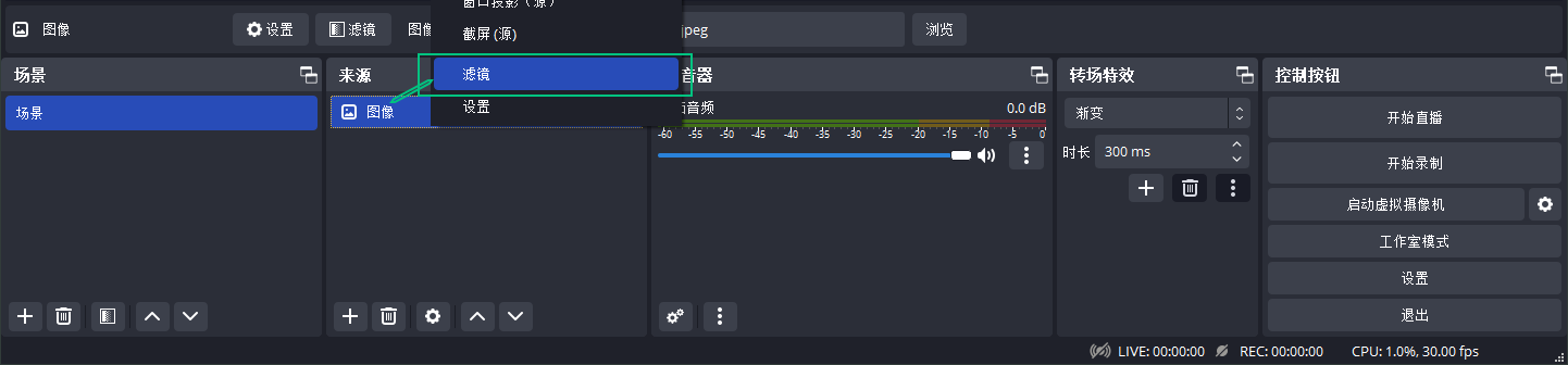 选择在直播来源(图片、视频…)上右键选择“滤镜”,
