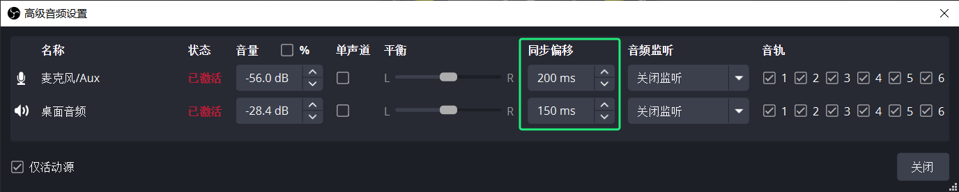 - 如果音频延迟问题仍然存在,您可以尝试在混音器面板中调整音频源的同步偏移。您可以以毫秒为单位增加或减少同步偏移,以使音频与视频同步。