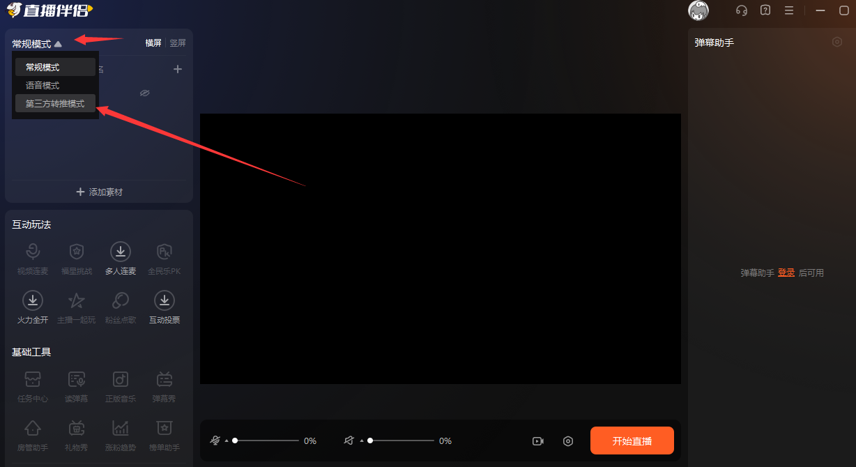 下载安装并打开 PC 端的斗鱼直播伴侣工具,在右上角,有三个模式,选择第三方转推模式。获取推流地址和直播码。