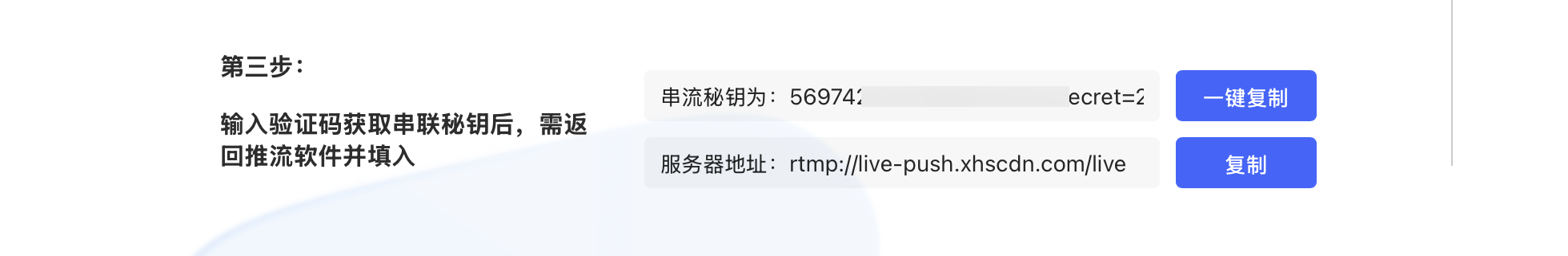 3、此时串流密钥已产生,如下图(服务器地址+串流密钥/推流码);