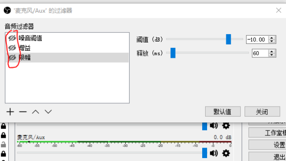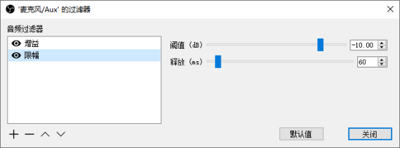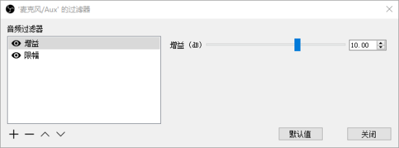 每个音频设备都可以单独设置增益,限幅就拿这里的麦克风来举例,因为麦克风本来声音小我添加了增益,但有时东西掉地上会产生爆音所以我添加了限幅,在空白处右键或点加号即可添加,数值需要自己看情况调