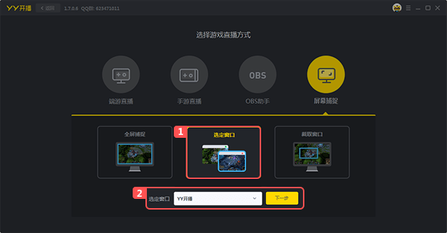 ①选择选定窗口,在选定窗口中,选择要直播的游戏窗口,点击“下一步”按钮: